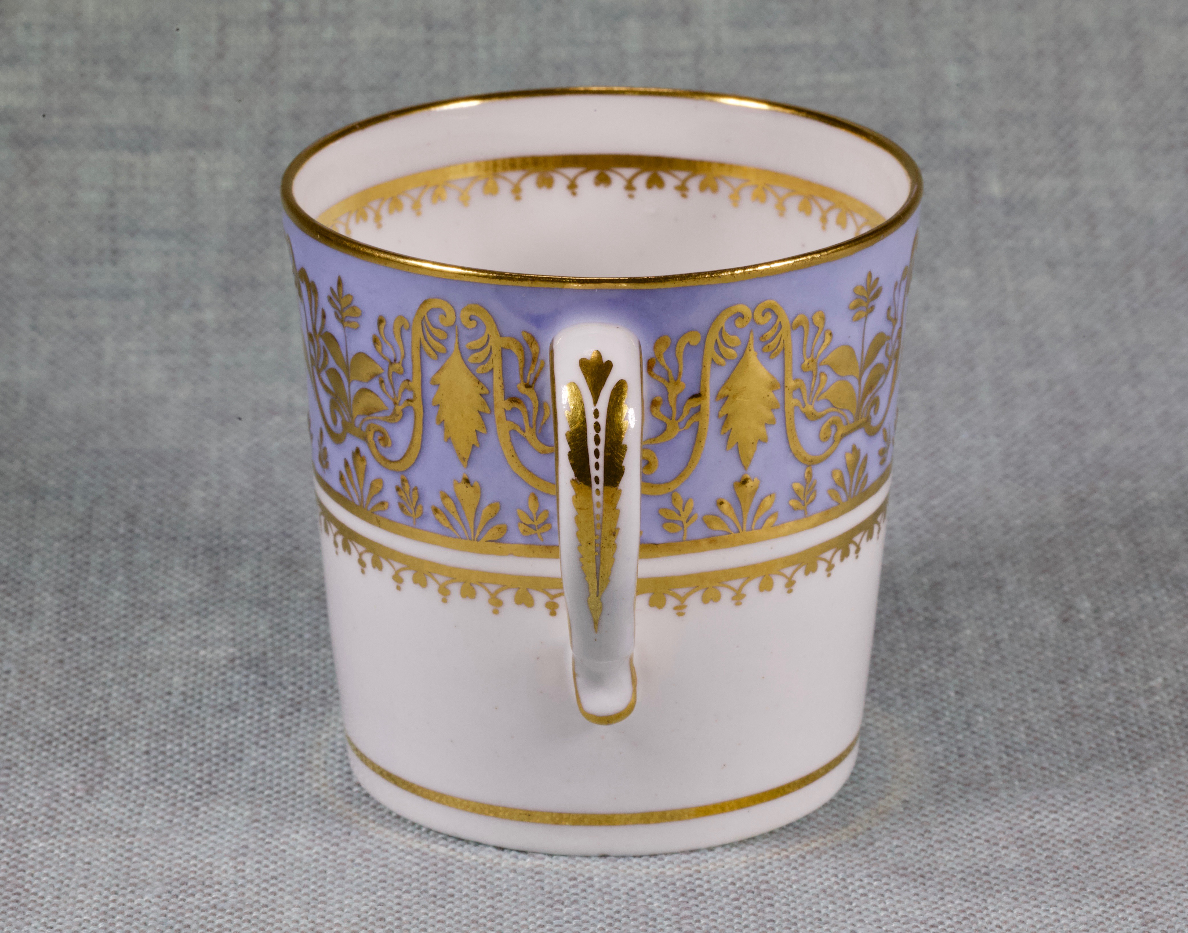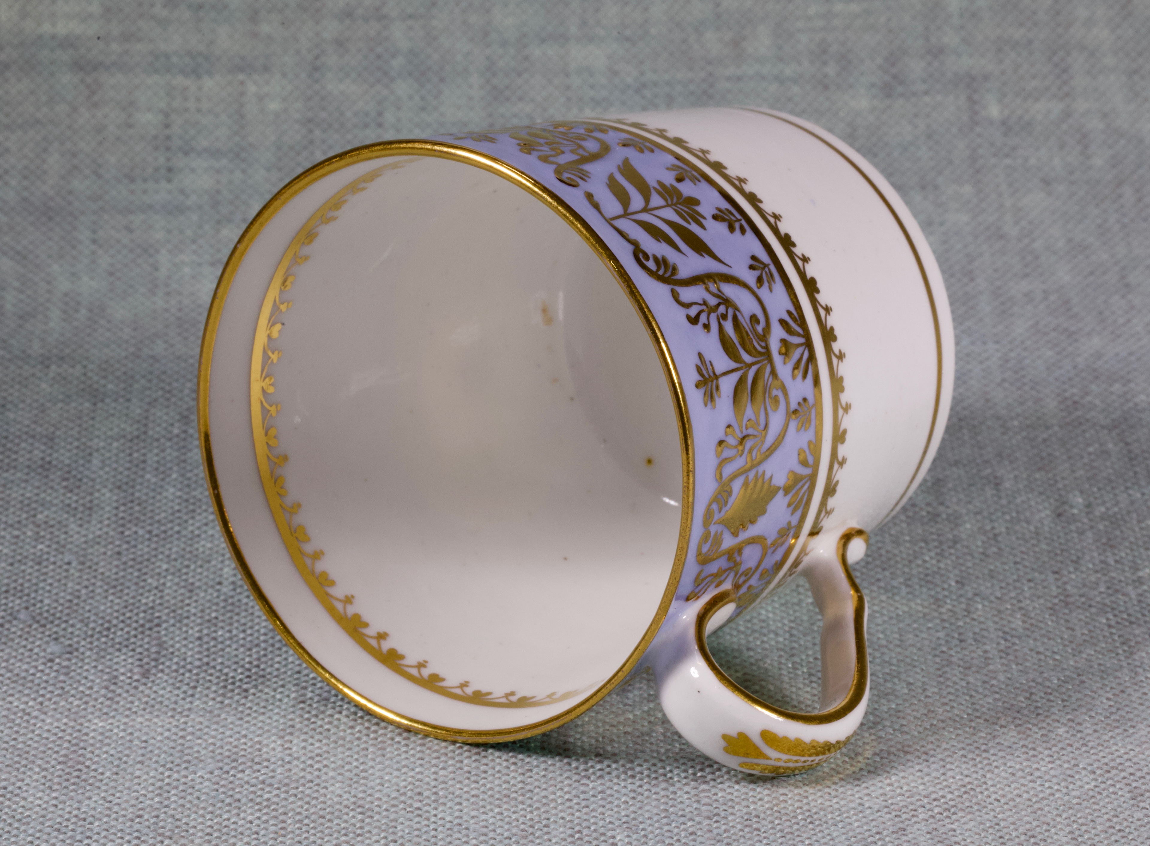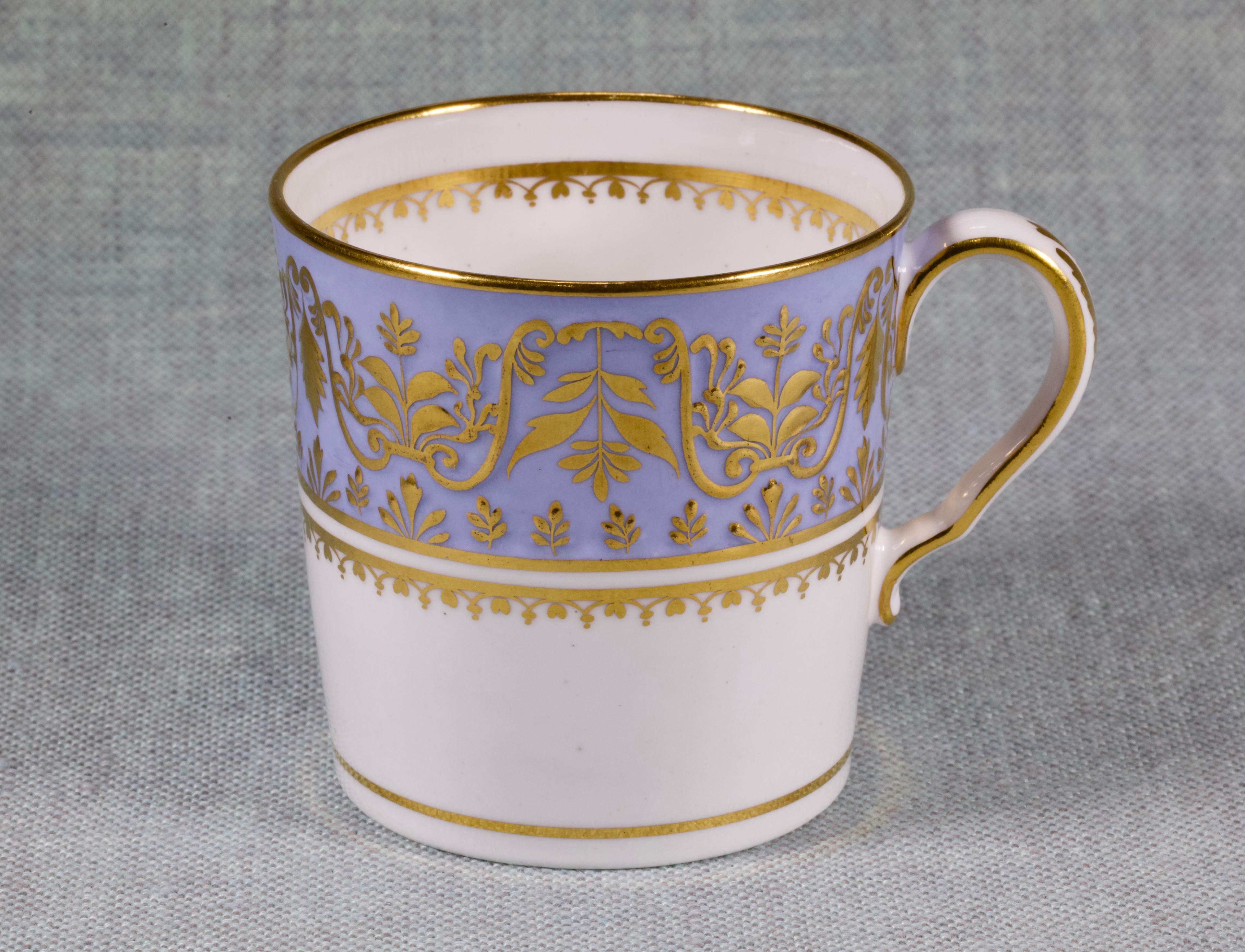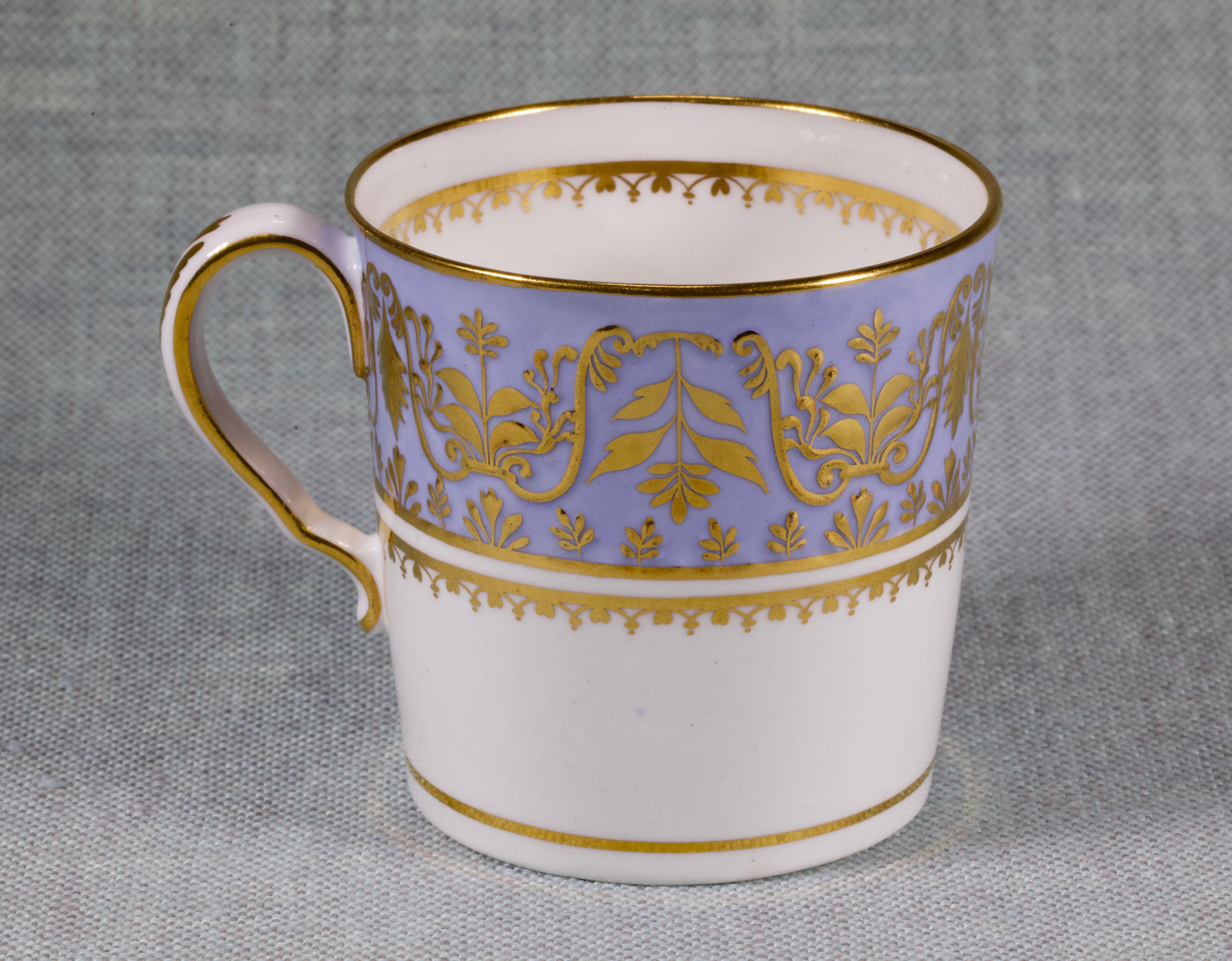 This pattern is decorated with a wide band of pale lavender blue enamel to the top half of the coffee can which has been applied over 'Swag Embossed' moulding & it has been further embellished with gilt on the raised areas of the design plus gilt bands below. This pale lavender blue enamel is very popular c1816.