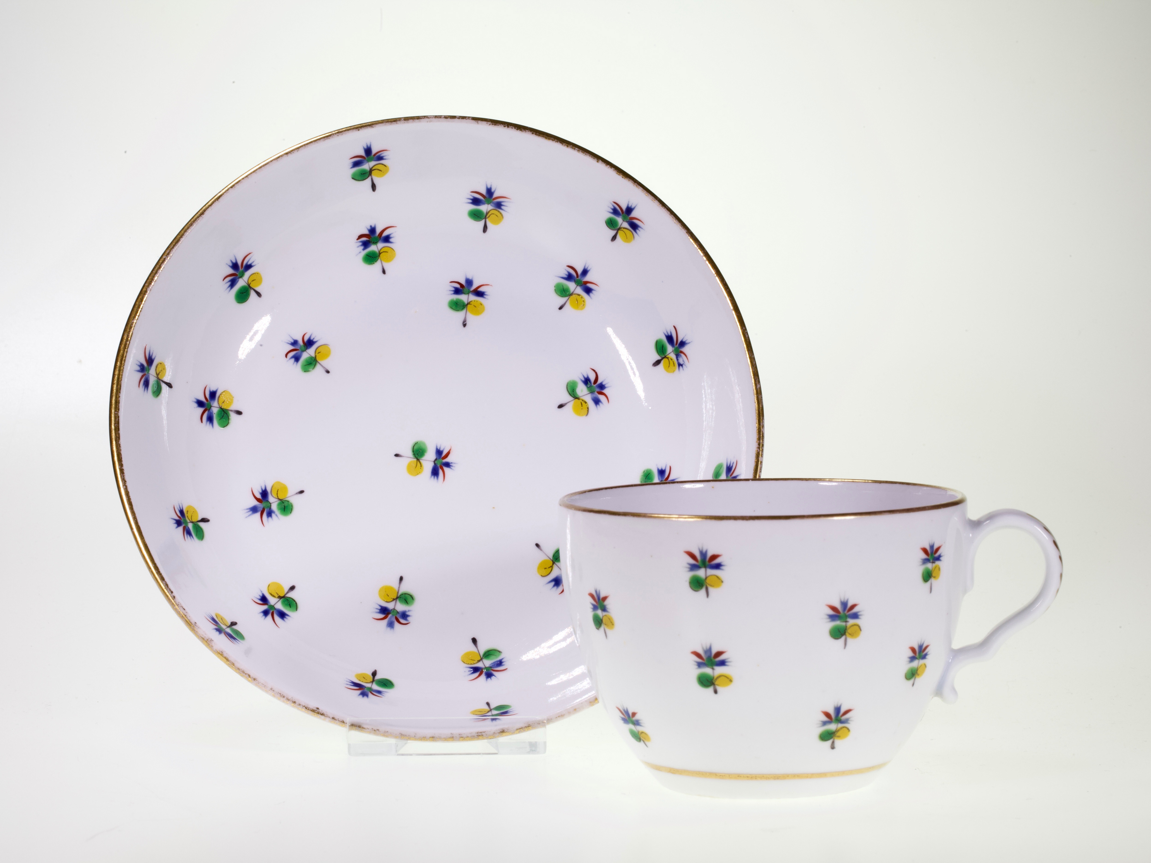 Pattern 517 Spode bone china Bute shape Tea Cup & Saucer produced by Josiah Spode II c1803, it is all hand-painted & decorated in a variation of the 'French Sprig' design. 'French Sprig' had been popular in the late 18th century & had been produced by several early English porcelain manufacturers (Worcester, Caughley & Derby). The design had also been produced by several ceramic manufacturers in France and came to the UK from France hence its name. It was a design that would wane in fashion terms very quickly once Spode had produced his version due to the outbreak of war with France later that same year.