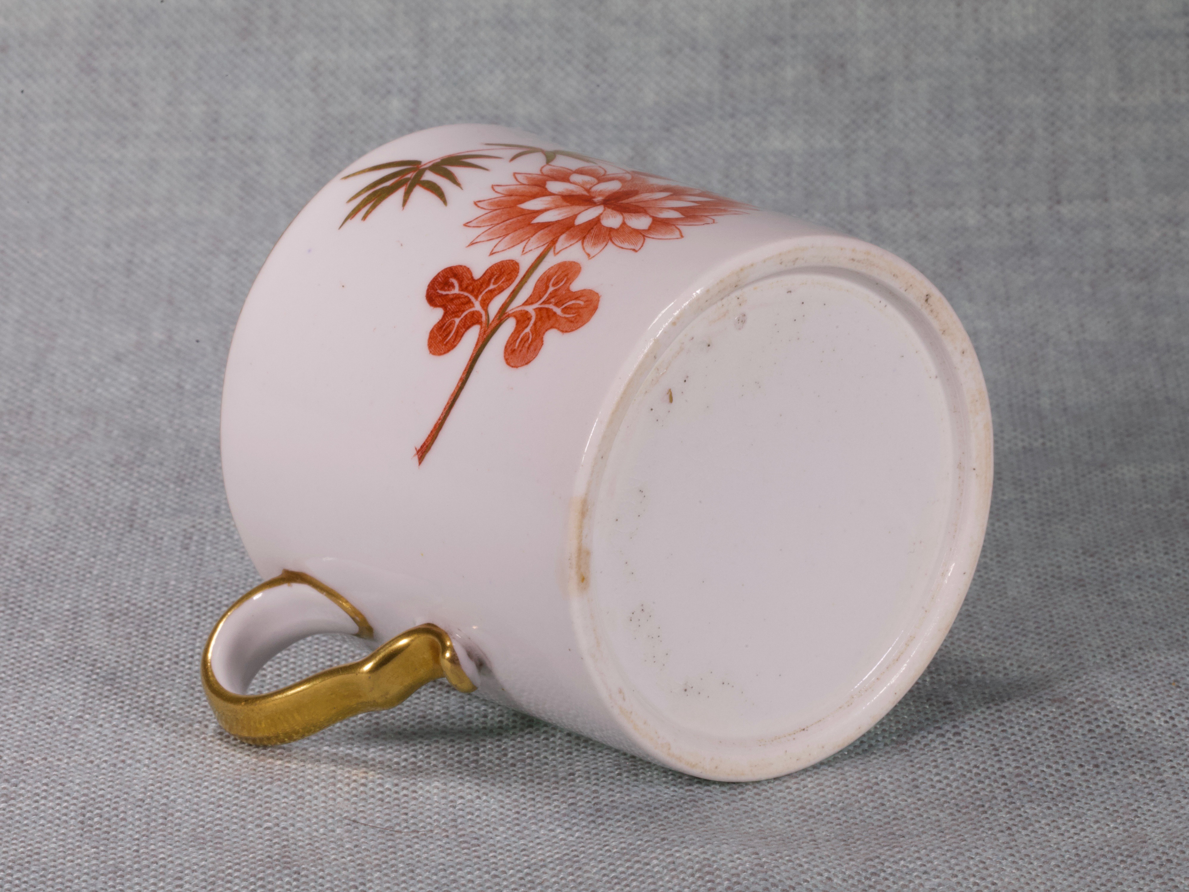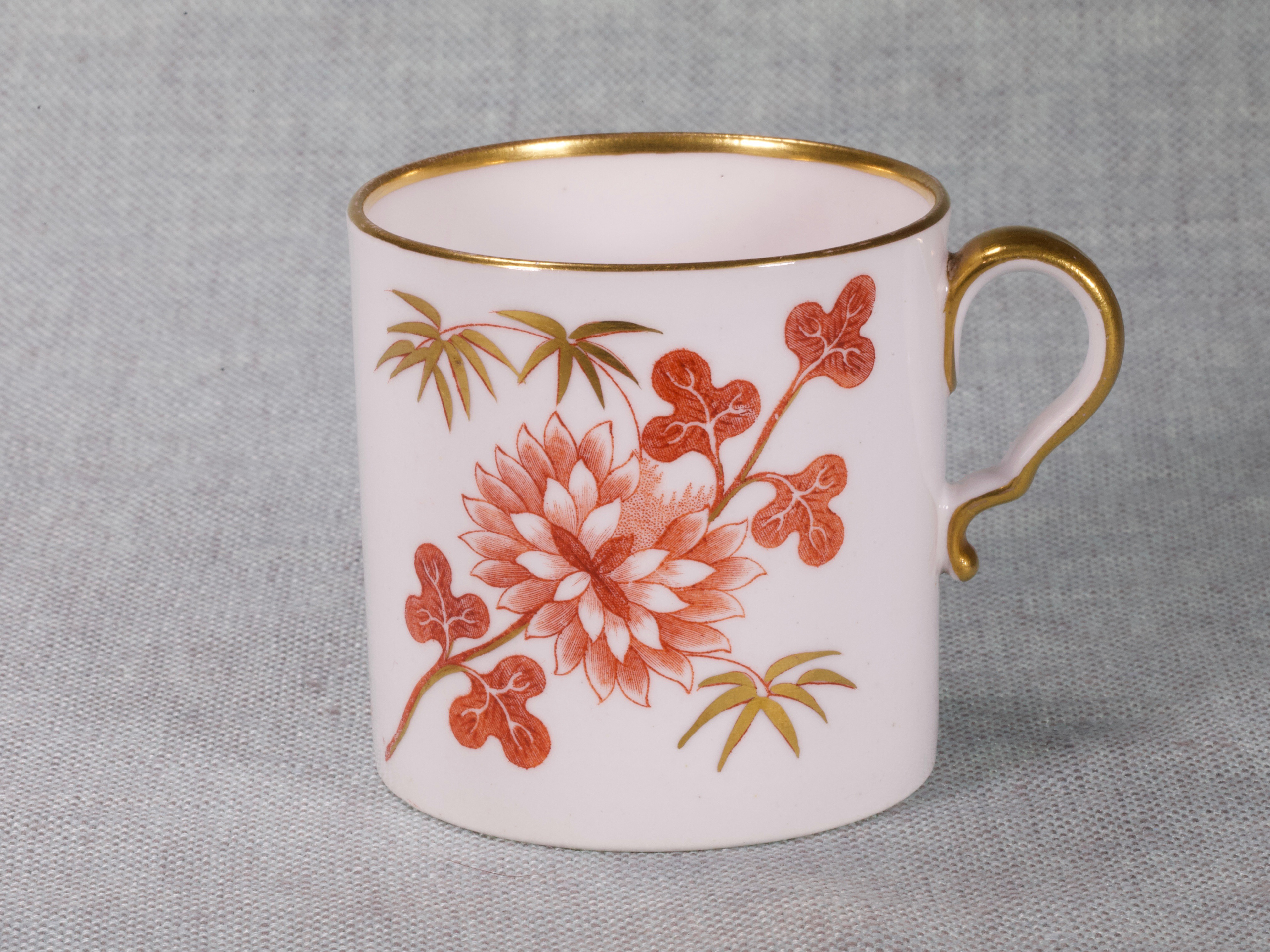 Pattern 981 Spode bone china Bute shape Coffee Can introduced in 1806. This is a Chinese inspired design printed in iron-red enamel by Spode's newly developed method of on-glaze 'Pluck & Dust' printing. Here is a link to explain the process, http://printedbritishpotteryandporcelain.com/how-was-it-made/pluck-dust-overglaze-printing-hot-press The print is known as P501 'Bamboo' and has gilt highlights, it is very charming, graceful & simple.